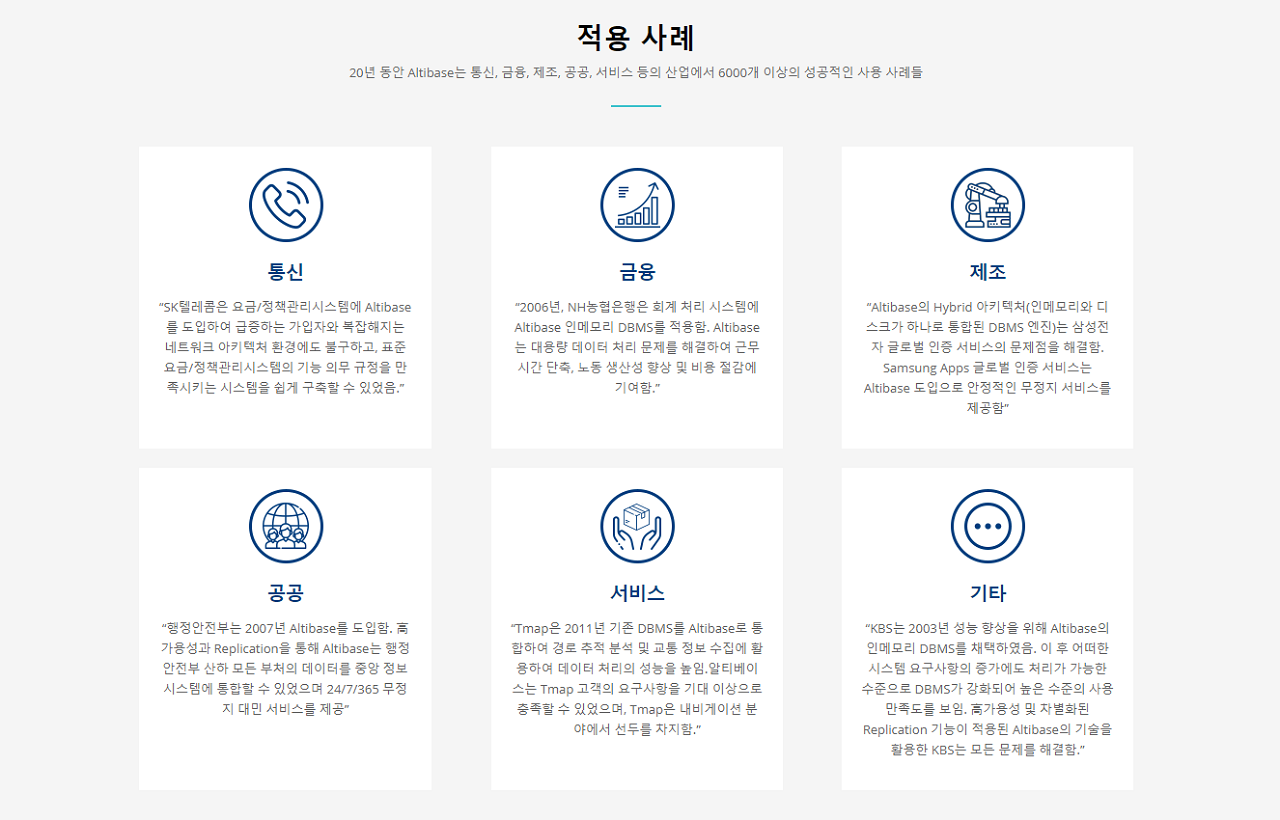 Altibase´Â »ï¼º, Çö´ë, China Mobile, E*Trade Áõ±Ç µî Àλó±íÀº °í°´ »ç·Ê¸¦ º¸À¯Çϰí ÀÖ½À´Ï´Ù.