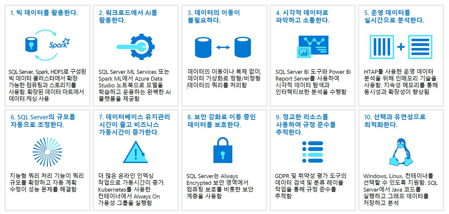 SQL Server´Â ¾÷°è¿¡¼­ °¡Àå ¶Ù¾î³­ ¼º´É°ú º¸¾È ±â´ÉÀ» Á¦°øÇÕ´Ï´Ù ¿øÇÏ´Â ¾ð¾î¿Í Ç÷§ÆûÀ» ¼±ÅÃÇÒ ¼ö ÀÖ°í, Á¤Çü µ¥ÀÌÅÍ¿Í ºñÁ¤Çü µ¥ÀÌÅ͸¦ ¸ðµÎ Ȱ¿ëÇÕ´Ï´Ù.