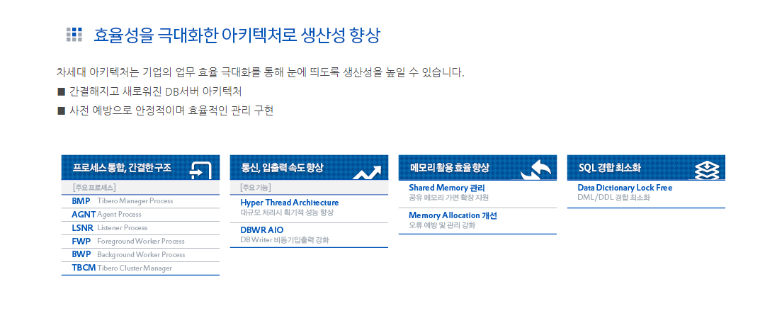 Tibero´Â Â÷º°È­µÈ ¾ÆÅ°ÅØÃ³¿Í ´Ù¾çÇÑ ±â´ÉÀÌ ¹Ý¿µµÈ Tibero 6´Â ƯÁ¤ ȯ°æÀÇ Á¾¼ÓÀ¸·ÎºÎÅÍ º¯È­¸¦ Èñ¸ÁÇÏ´Â ±â¾÷¿¡°Ô ÀûÇÕÇÑ ¼Ö·ç¼ÇÀÔ´Ï´Ù.